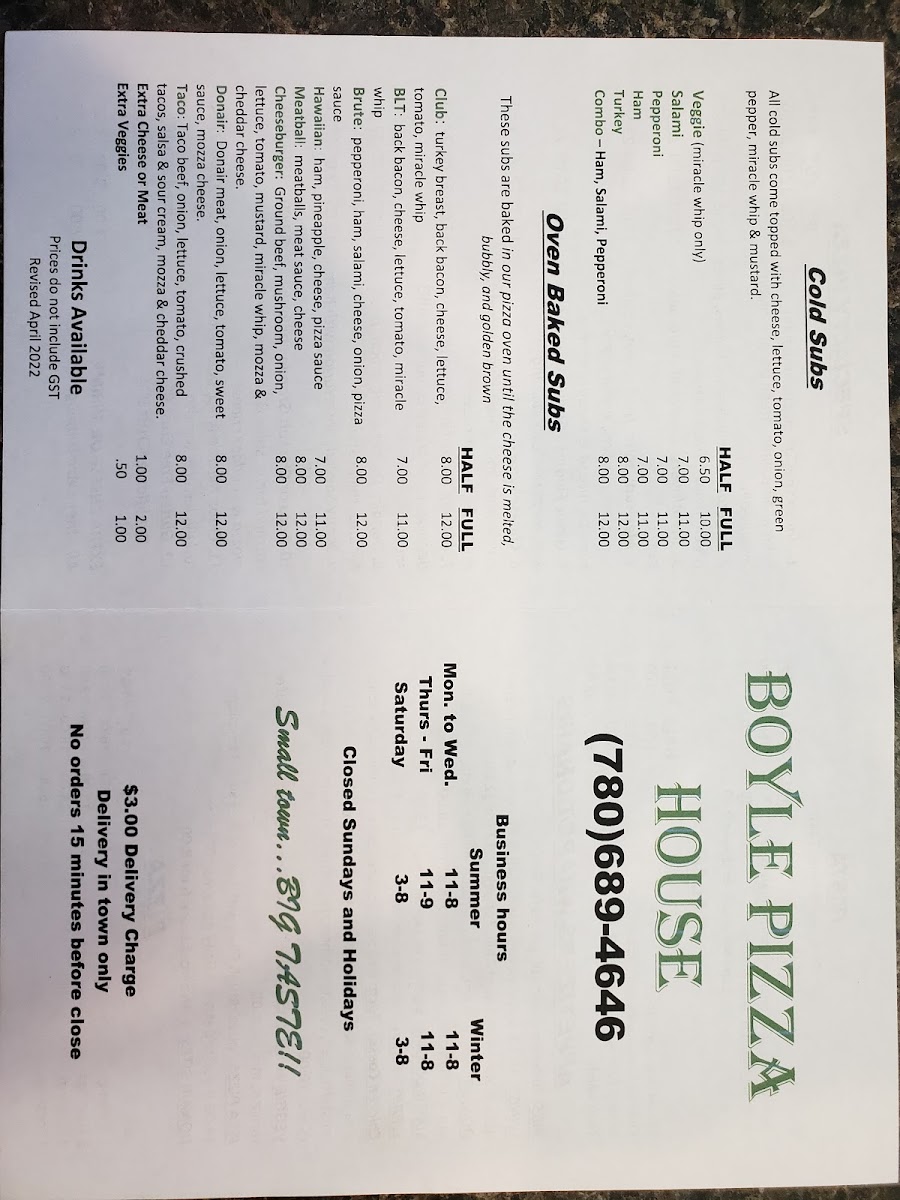 Welcome to Boyle Pizza House, a delightful gem tucked away in Boyle, Alberta. This charming eatery is quickly gaining a reputation for serving some of the best pizza around. The menu features a variety of offerings, including traditional pizzas and unique creations, such as the delicious Pita Pizza, which combines Italian sausage, shrimp, and chicken with a flavorful donair sauce.